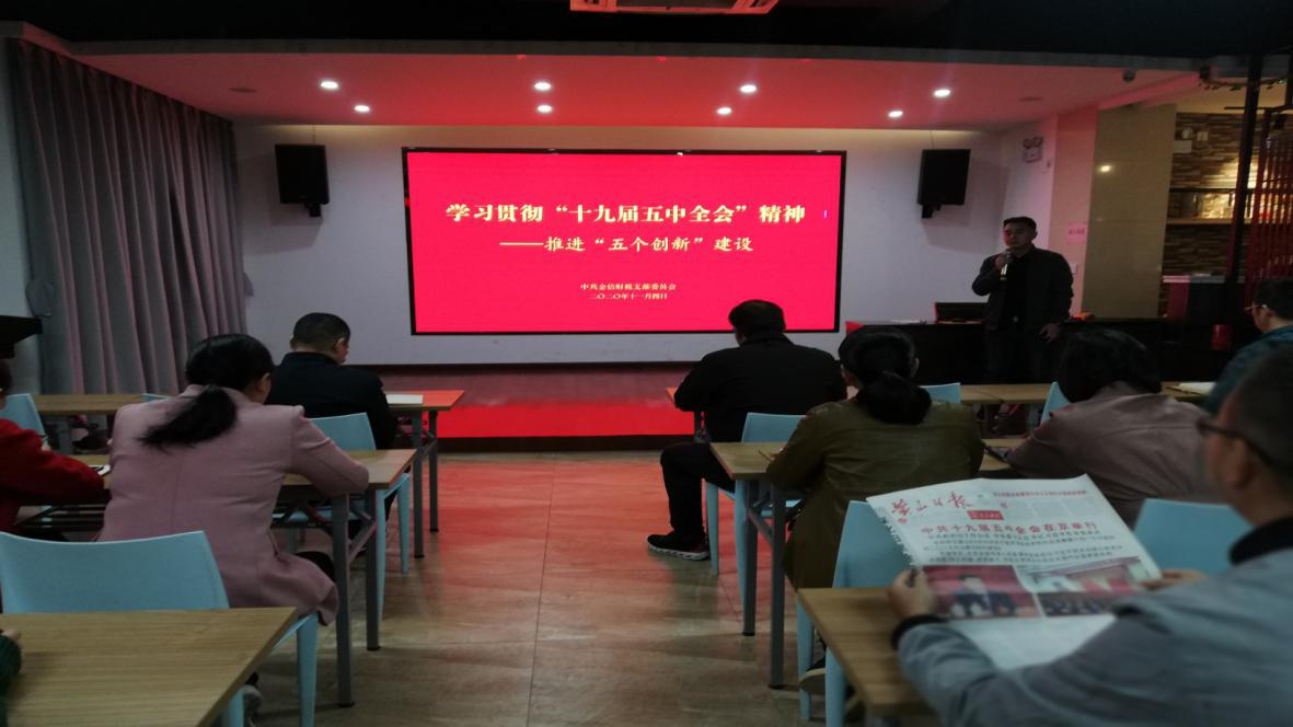 2020年11月4日,金信財(cái)稅黨支部在公司一樓會(huì)議室組織全體黨員及員工認(rèn)真學(xué)習(xí)“十九屆五中全會(huì)”精神,并結(jié)合公司實(shí)際,繼續(xù)大力推進(jìn)“五個(gè)創(chuàng)新”建設(shè)。支部宣委方志義在會(huì)上做動(dòng)員講話,組委吳云平進(jìn)行學(xué)習(xí)部署,并且提出具體要求。