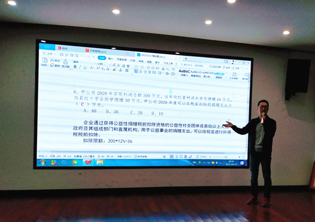 測(cè)試結(jié)束后,中心副主任、注冊(cè)會(huì)計(jì)師汪銘對(duì)測(cè)試題進(jìn)行分析和解答,并對(duì)相關(guān)重點(diǎn)、難點(diǎn)、易錯(cuò)點(diǎn)著重講解。通過書面測(cè)試及考后講解,中心服務(wù)人員對(duì)相關(guān)的知識(shí)考點(diǎn)及稅收政策等會(huì)有更全面的了解,有助于加強(qiáng)和鞏固專業(yè)知識(shí)的學(xué)習(xí)和提升,更好的為客戶做好服務(wù)。