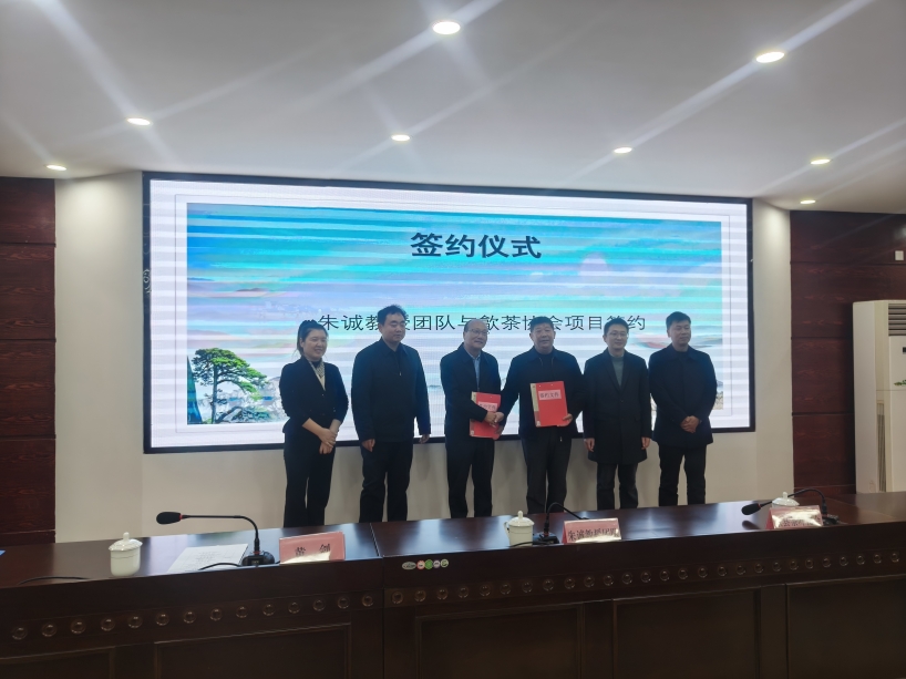 歙縣茶葉協(xié)會與中國計量大學朱誠科研團隊達成合作意向,黃劍等共同見證簽約儀式。