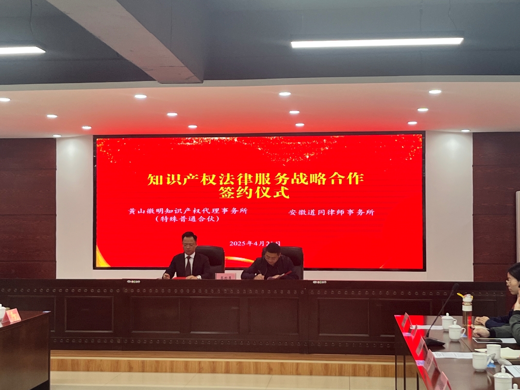 當(dāng)日,黃山本土專利代理機構(gòu)組織召開“共話未來趨勢 共謀發(fā)展機遇”交流座談會,金信集團所屬的專利代理機構(gòu)徽明事務(wù)所所長胡海鋒與道同律師事務(wù)所管委會主任洪徽各自介紹本土知識產(chǎn)權(quán)業(yè)務(wù)情況和未來發(fā)展規(guī)劃,并現(xiàn)場簽訂戰(zhàn)略合作協(xié)議。