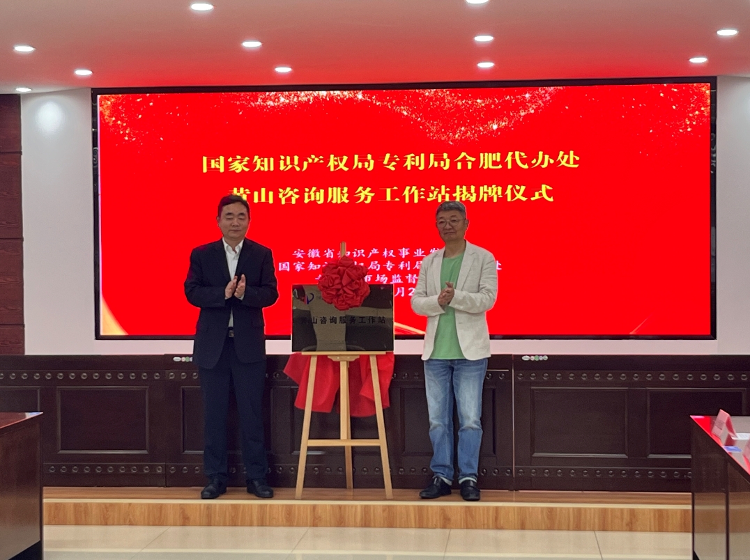 揭牌儀式上,孫雄軍宣讀省知識產(chǎn)權(quán)事業(yè)發(fā)展中心《關(guān)于同意設(shè)立國家知識產(chǎn)權(quán)局專利局合肥代辦處黃山咨詢服務(wù)工作站的批復(fù)》皖知中[2025]9號,丁濤主任宣布黃山咨詢服務(wù)工作站開通辦理業(yè)務(wù)。最后,出席活動的丁濤主任和黃劍局長共同揭開國家知識產(chǎn)權(quán)局專利局合肥代辦處黃山咨詢服務(wù)工作站站牌,標志著國家知識產(chǎn)權(quán)局專利局合肥代辦處黃山咨詢服務(wù)工作站正式運營。